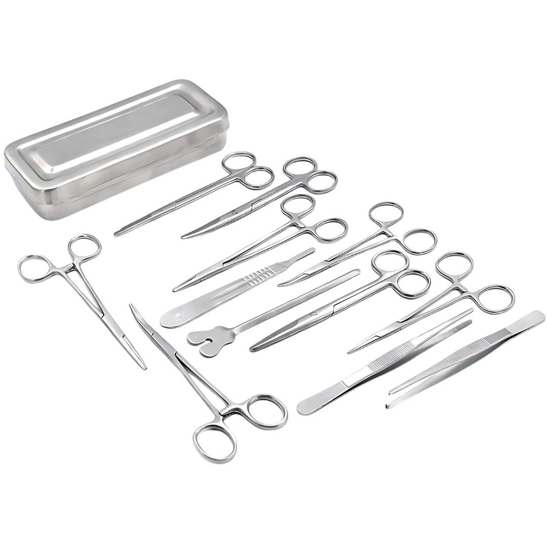 The set comes securely packed in a sturdy stainless steel box, offering safe storage, easy transport, and added protection for all instruments. This makes it highly convenient for use in classrooms, laboratories, training sessions, and clinical environments. Whether used for learning, practice, or minor surgical applications, the KYNEA SURGICAL 13 pcs kit is built to deliver long-term value and consistent results.