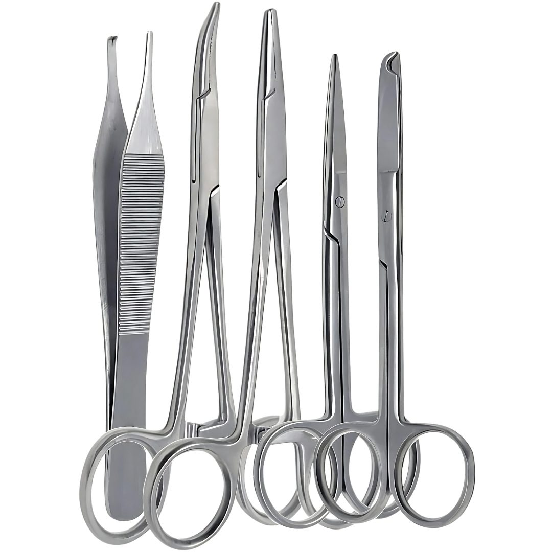 Each instrument is manufactured from high-quality surgical stainless steel, ensuring durability, resistance to corrosion, and reliable performance in every procedure. The sharp scissors allow for precise cutting, the needle holder provides secure control during suturing, and the hemostat ensures effective clamping of blood vessels. Forceps and tweezers offer excellent handling of tissues and sutures, making this set a practical choice for day-to-day veterinary needs.